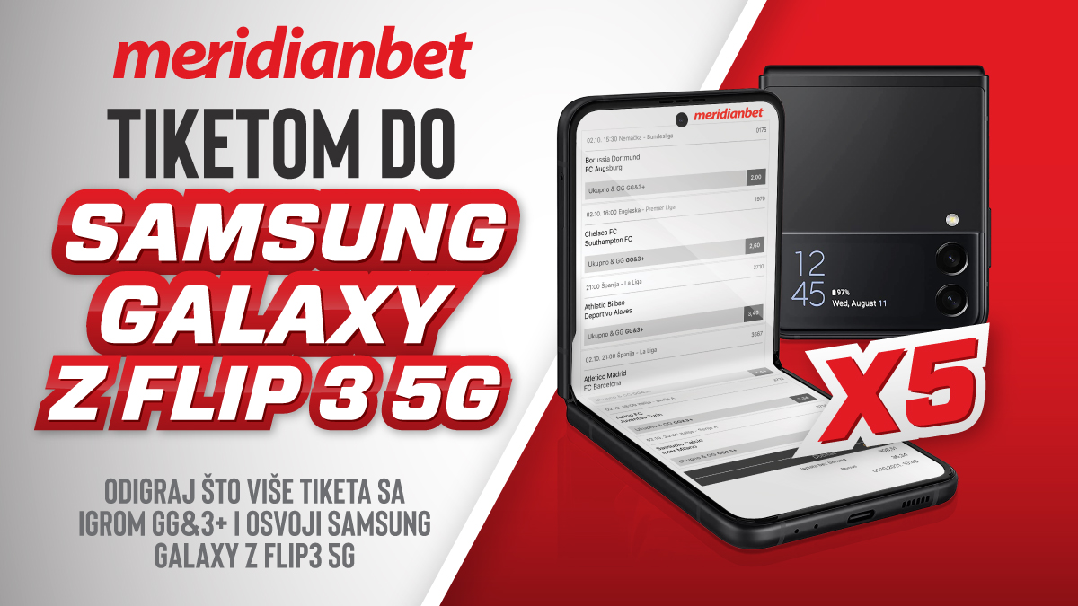 Sportska kladionica Meridian pomjera sopstvene granice – Samsung Flip, telefon koji ostavlja bez daha, a sve što je potrebno je da odigraš tiket sa igrom gg3+, minimum 4 para i minimalnom pojedinačnom kvotom 1.20.