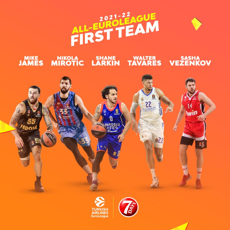 U idealnoj petorci nalaze se igrač Barselone Nikola Mirotić, Majk Džejms iz Monaka, Šejn Larkin iz Efesa, igrač Olimpijakosa Saša Vezenkov i centar Real Madrida Valter Tavares.