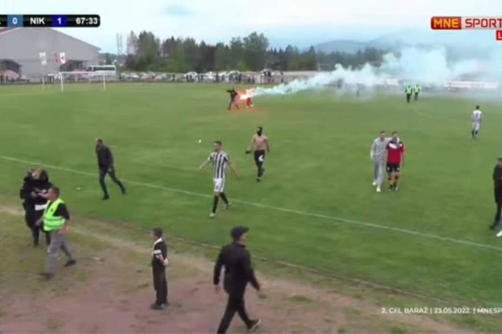 Nakon što su Nikšićani postigli gol domaći navijači su upalili bakljadu, potom i utrčali na teren i napali gostujuće igrače.