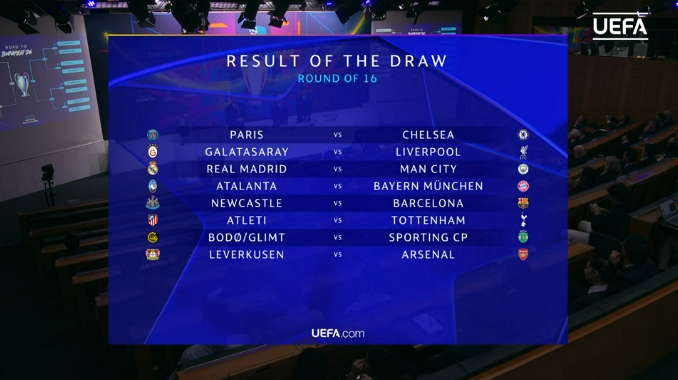 Barselona će igrati protiv Njukasla, Pari Sen Žermen protiv Čelsija, Arsenal protiv Bajer Leverkuzena, Liverpul protiv Galatasaraja, Totenhem protiv Atletiko Madrida, a Sporting protiv Bode-Glimta.