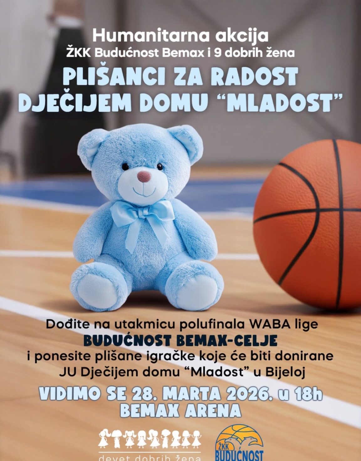 Kako su kazali organizatori akcije, skupljaju se plišane igračke koje će tačno na početku utakmice Budućnost Bemax – Celje (subota 28.mart u 18 časova), biti bačene na teren i sve će biti donirane Dječijem domu ,,Mladost” iz Bijele.