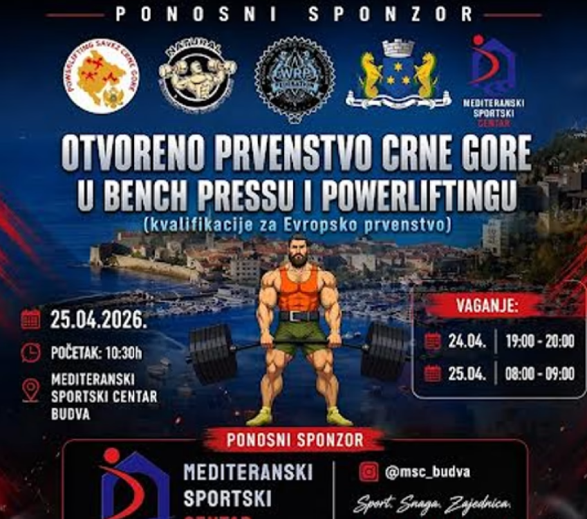 Mediteranski sportski centar u Budvi biće domaćin Otvorenog prvenstva Crne Gore u bench pressu i powerliftingu, koje će se održati 25. aprila 2026. godine sa početkom u 10:30 časova.